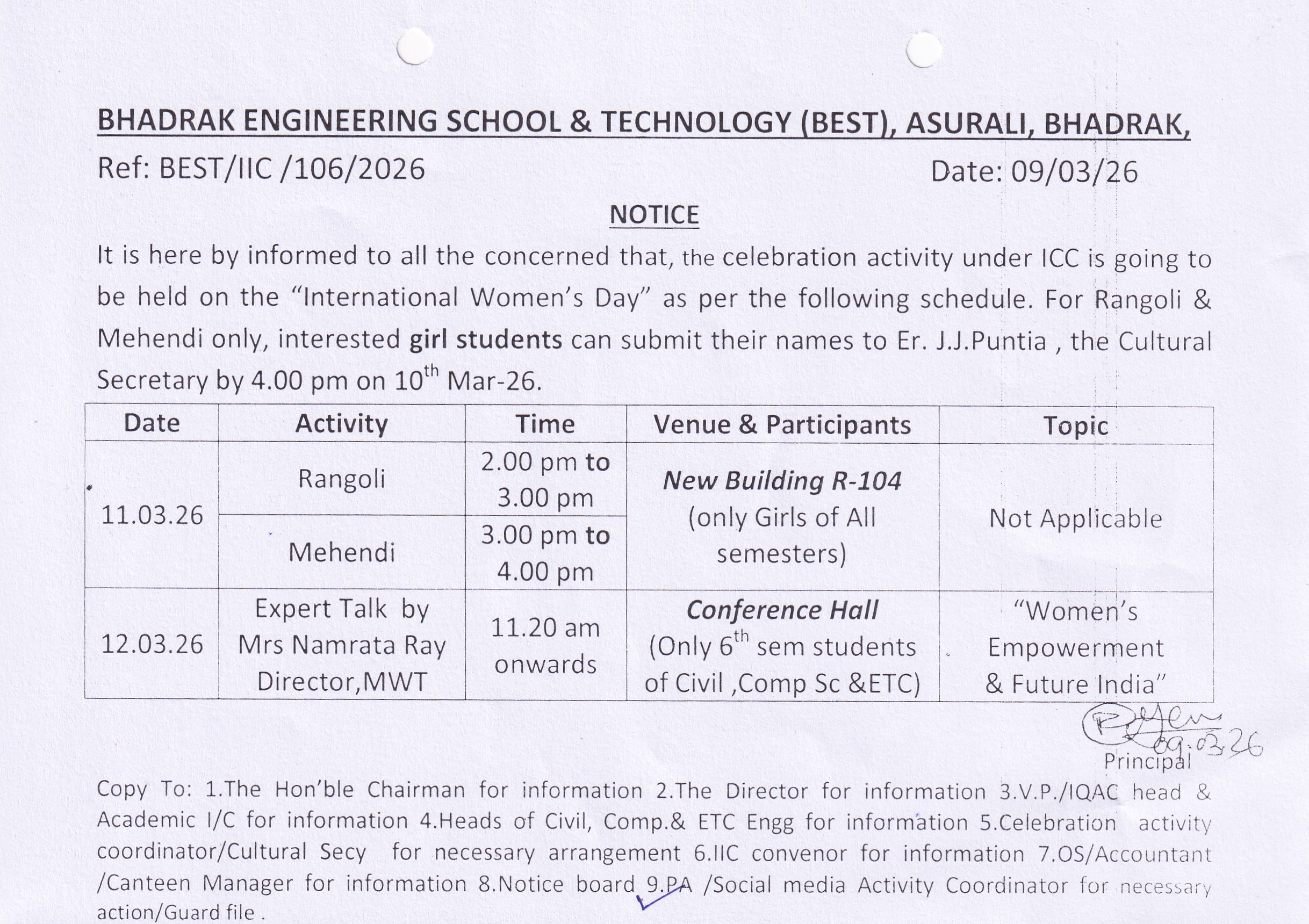 To strive towards higher levels of excellence and to make BEST a premier technical education. To become an institution of international eminence in moulding Engineers capable of addressing global challenges.